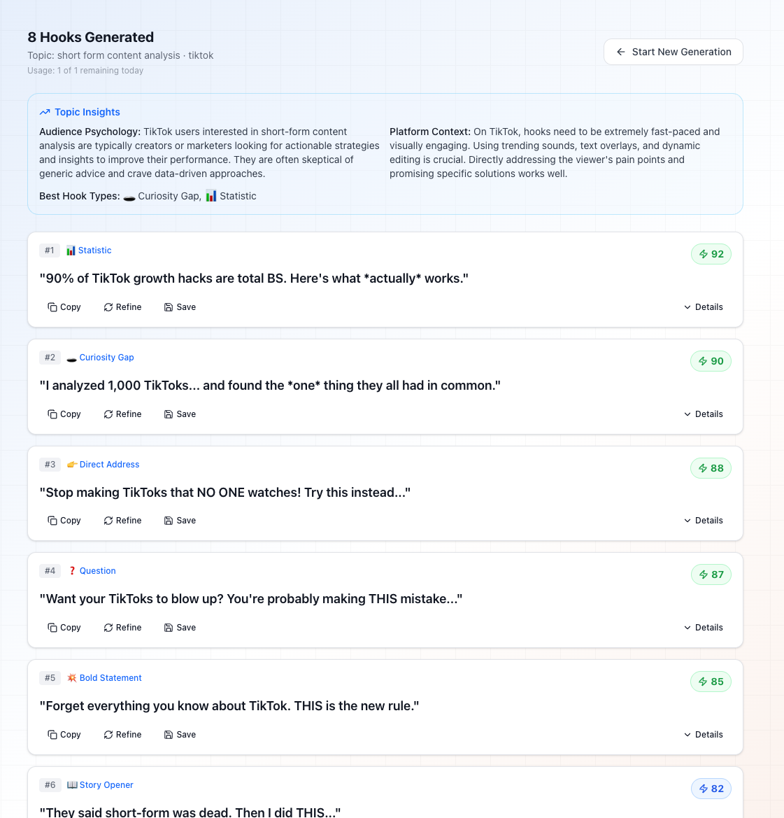 Le Hook Generator crée et note des accroches qui stoppent le scroll. Choisissez la meilleure avant de tourner.