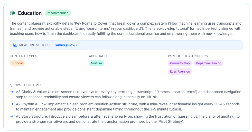 "Votre idée se classe mieux en tutoriel. Confiance : élevée. Levier psychologique : curiosité. 3 conseils d'optimisation prêts."