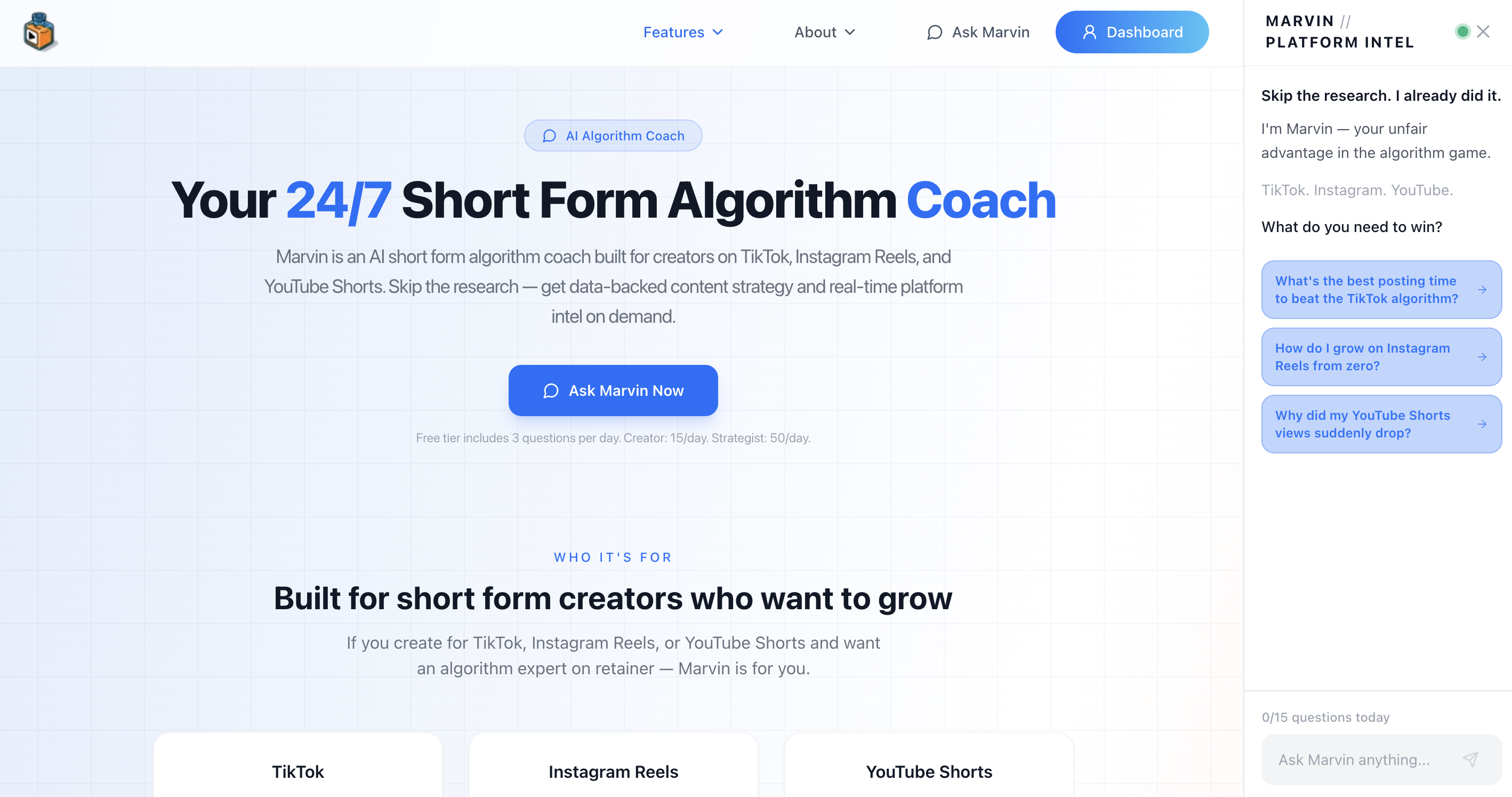 Marvin répond à toutes vos questions short-form avec une stratégie adaptée par plateforme. Disponible 24h/24.
