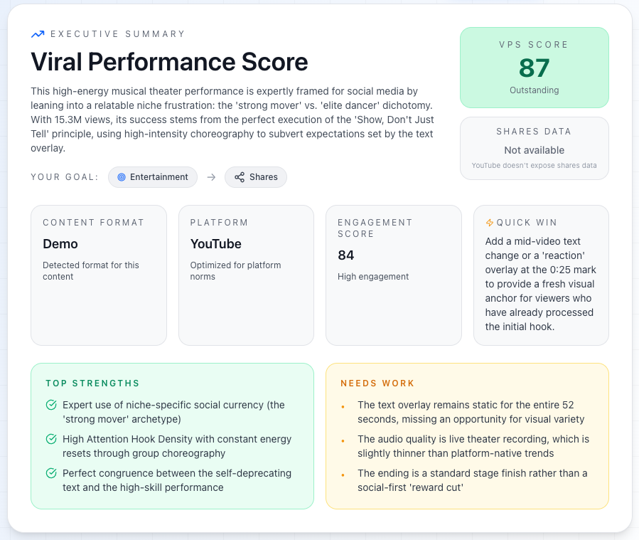Voyez exactement pourquoi une vidéo a floppé — et quoi changer sur la prochaine.